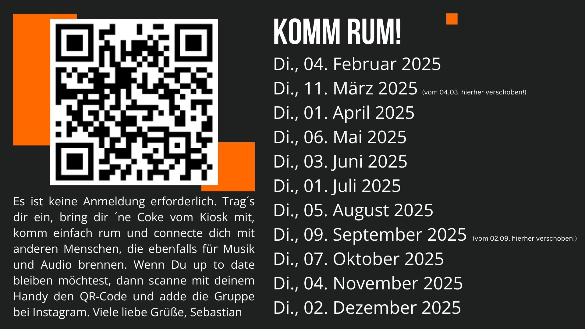 Es ist keine Anmeldung erforderlich. Trag´s dir ein, bring dir ´ne Coke vom Kiosk mit, komm einfach rum und connecte dich mit anderen Menschen, die ebenfalls für Musik und Audio brennen. Wenn Du up to date bleiben möchtest, dann und adde die Gruppe bei Instagram: